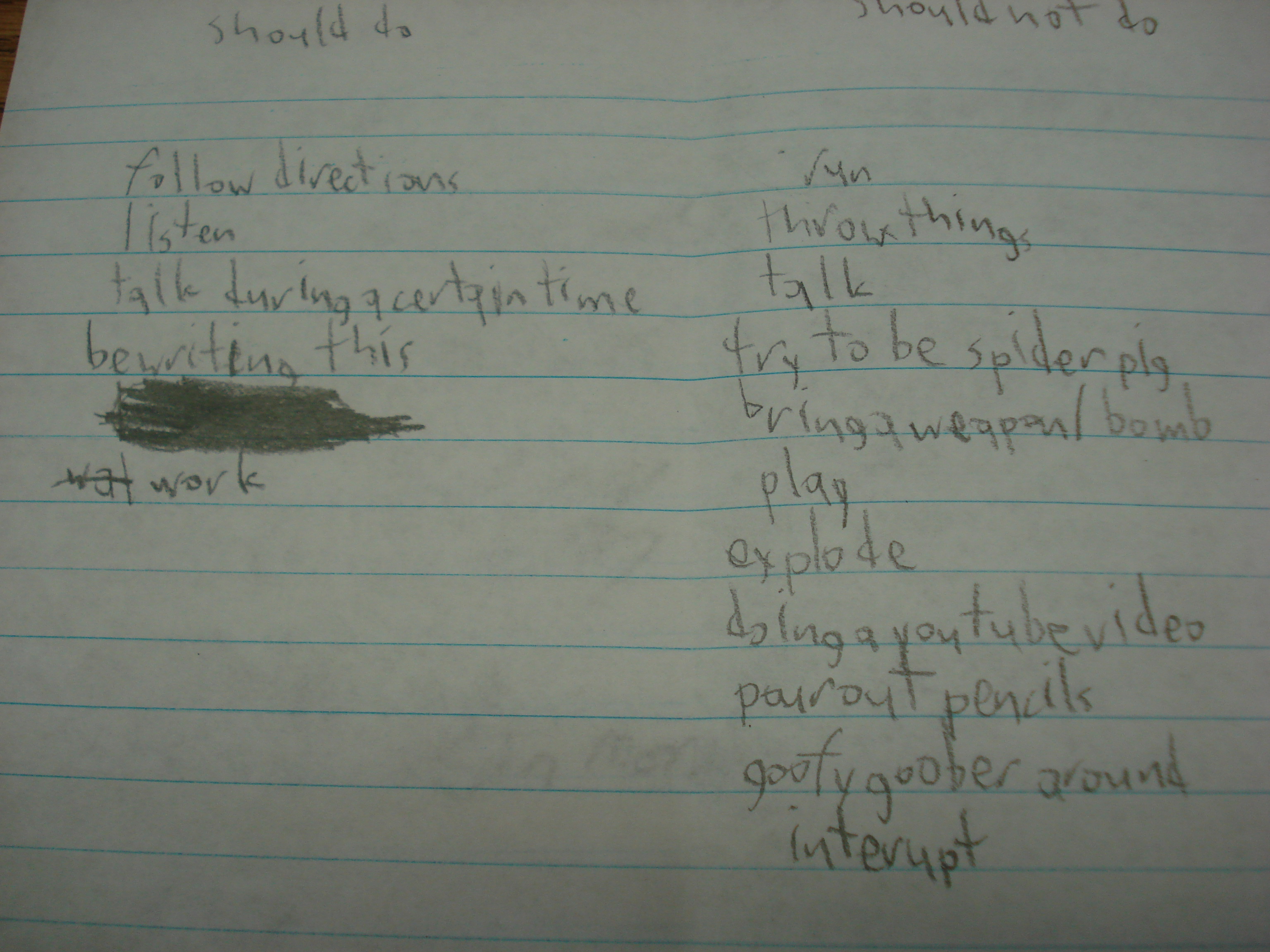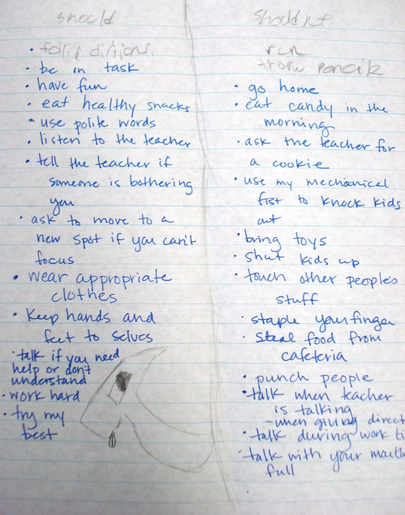Last school year I had one of my writing groups fold a piece of paper in half hot-dog style. (Hot-dog style is a teacher-term with which you should all familiarize yourselves. It’s very technical.) On the top of the paper I had them write “Should” and “Shouldn’t.” Then we took a few minutes to brainstorm things we should be doing during writing time and things we should not be doing during writing time. Here is a sample that exemplifies what I was looking for: