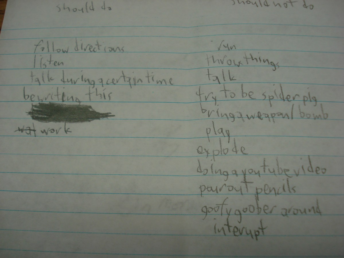 We compiled the ideas from this brainstorming session into a poster-appropriate list and I hung them up for the rest of the year. Clearly we did not include any references to spider pig or mechanical fists. We did, however, include fart noises. When things got goofy, I’d say something like, “I’m gonna need you guys to scan the list…where are we falling right now?” Or I’d praise them by pointing out all the things on the “Should” list they were exhibiting right then. Or I’d say something like, “Oh, man…which side of the list are fart noises on? Yeah, so should you be doing that now?” They’d all discussed and come to an agreement that fart noises were not something they wanted to deal with during their writing time, so it wasn’t me they were answering to, it was themselves.